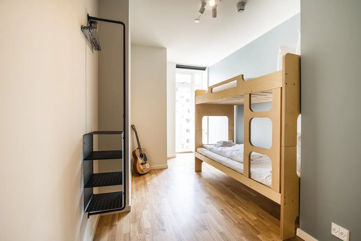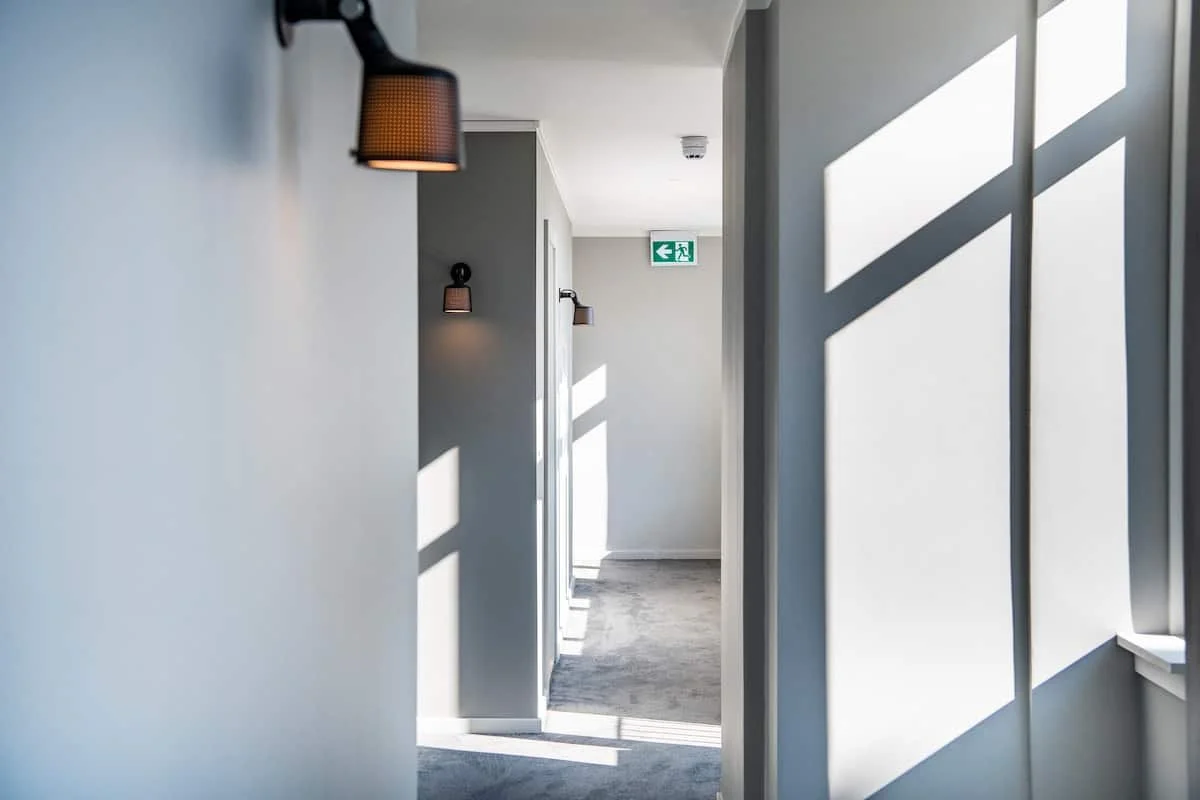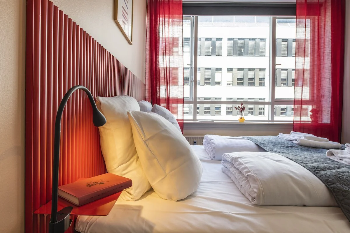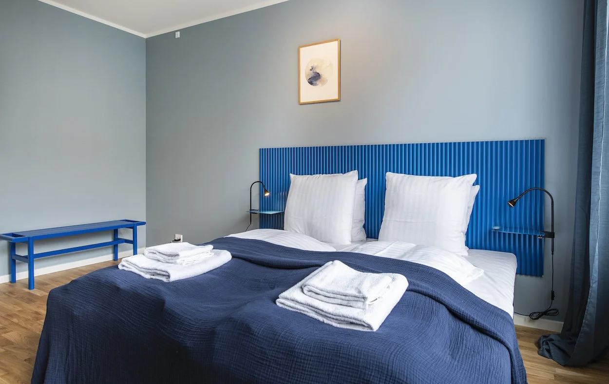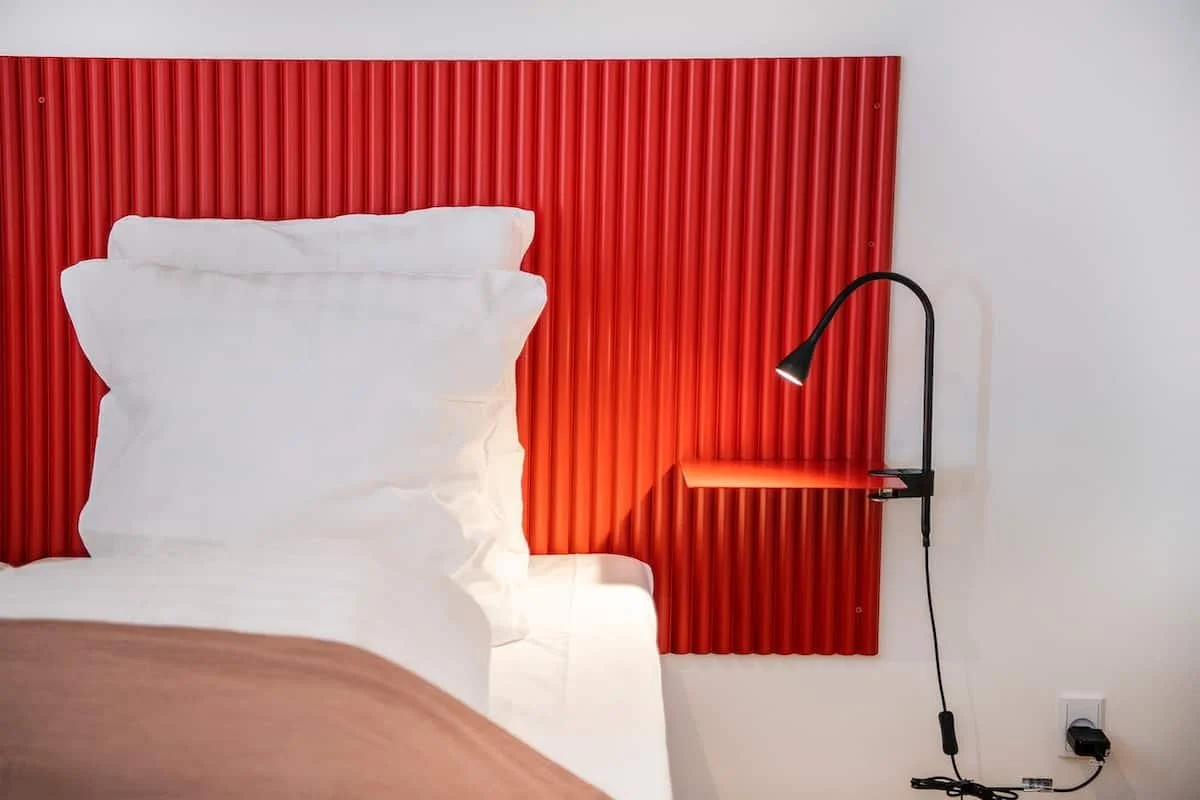 Nordisk egetræ og lange gardiner skaber en varm, hyggelig og hjemmelig atmosfære understøttet af farvevalgene i de lyse rum. Sengegavle i kontrastfarver, borde og glasvægge er specialdesign i samarbejde med Indretningsfabrikken.
